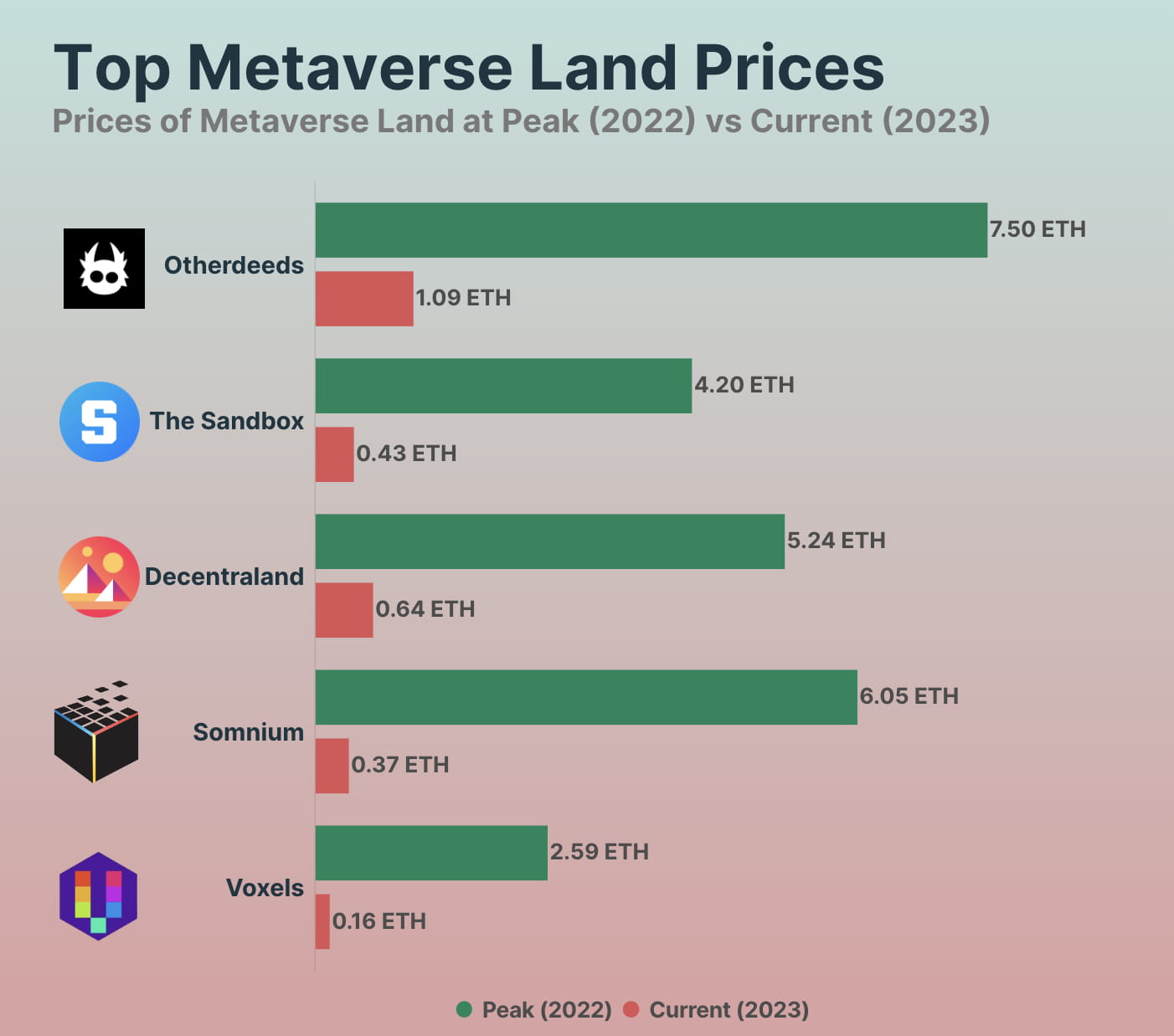 I progetti di terreni virtuali hanno visto i prezzi minimi scendere drasticamente tra il 2022 e il 2023. Somnium Space ha avuto il calo maggiore del -93,9% dal suo picco, seguito da Voxels con il -93,8%. Le altre tre raccolte sono scese di meno del 90%. Sandbox è sceso dell'-89,8%, Decentraland è sceso dell'-87,8% e Otherdeeds con una perdita dell'-85,5%.