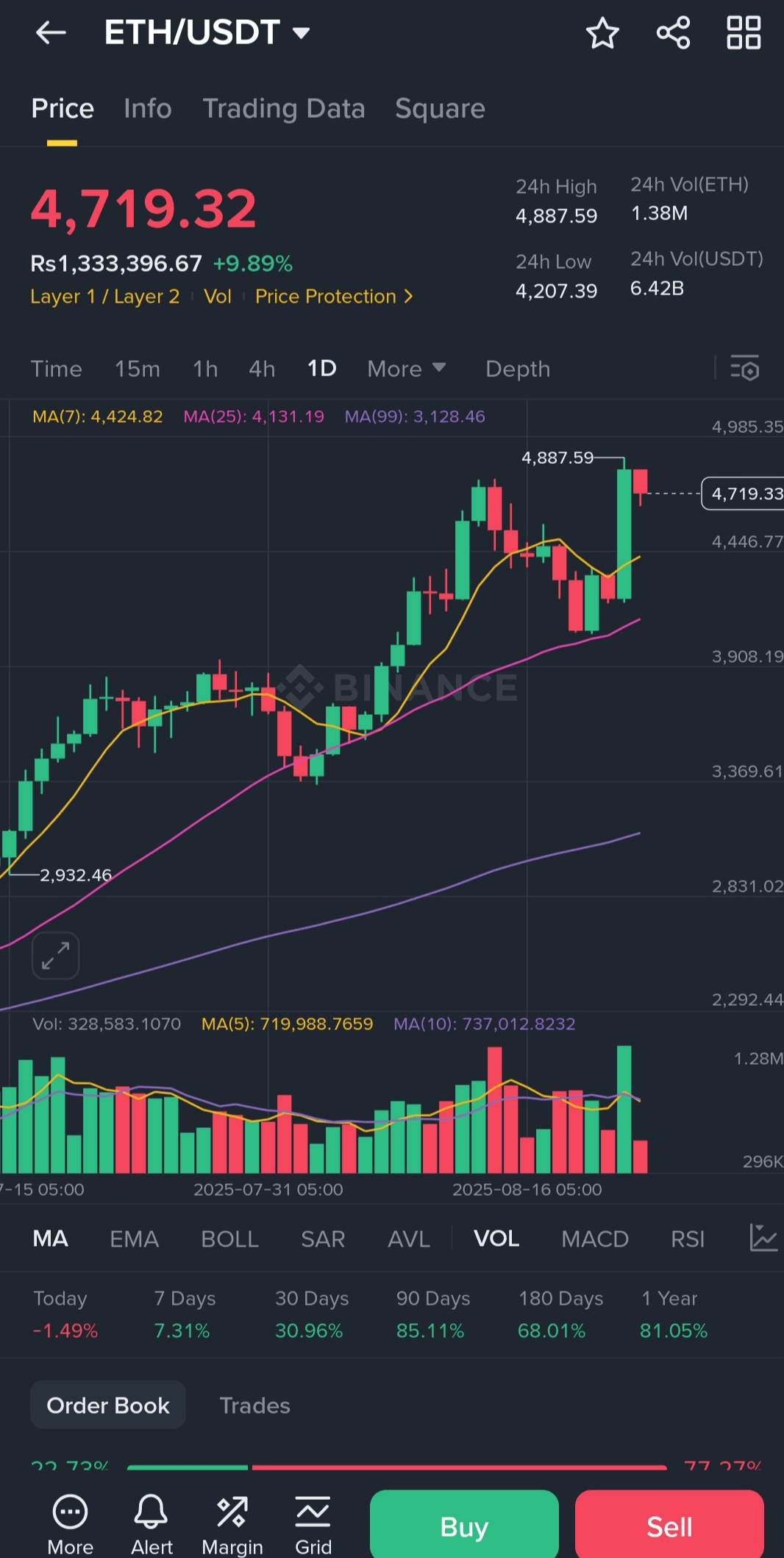 イーサリアムは市場で強く動いています🔥。$4,207から$4,887へのラリーの後、ETHは現在$4,725(+9.55%)付近で保持しています。