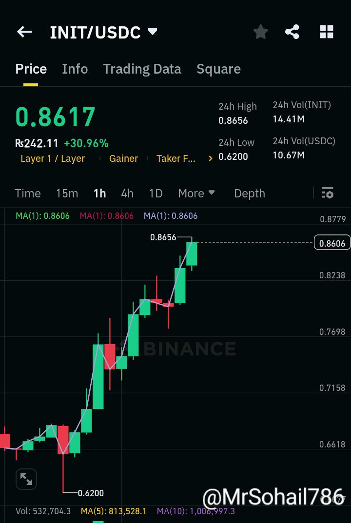 INIT ne 24h zemākā cena $0.62 palēcās līdz $0.8656 — gandrīz 40% kustība! Šobrīd cena konsolidējas ap $0.8606, kas varētu norādīt uz bullish karogu.