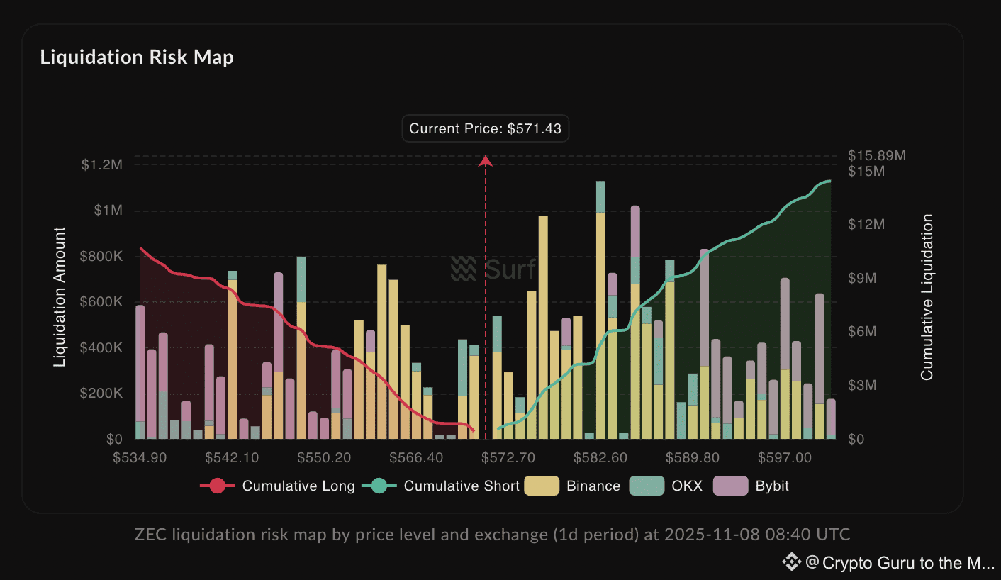 • Rủi ro thanh lý: Tổng vị thế long ~$41M tập trung quanh mức $534 — có khả năng gây “cascading liquidation” nếu thủng hỗ trợ.