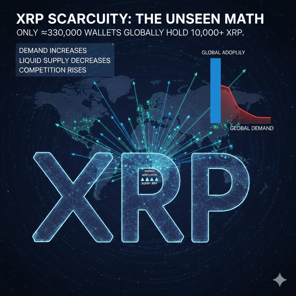 Saskaņā ar tīkla datiem, tikai apmēram 330 000 kases pasaulē satur 10 000 vai vairāk XRP. Tas nav pieņēmums vai teorija — tas ir mērāms blokārkārtes statistika.