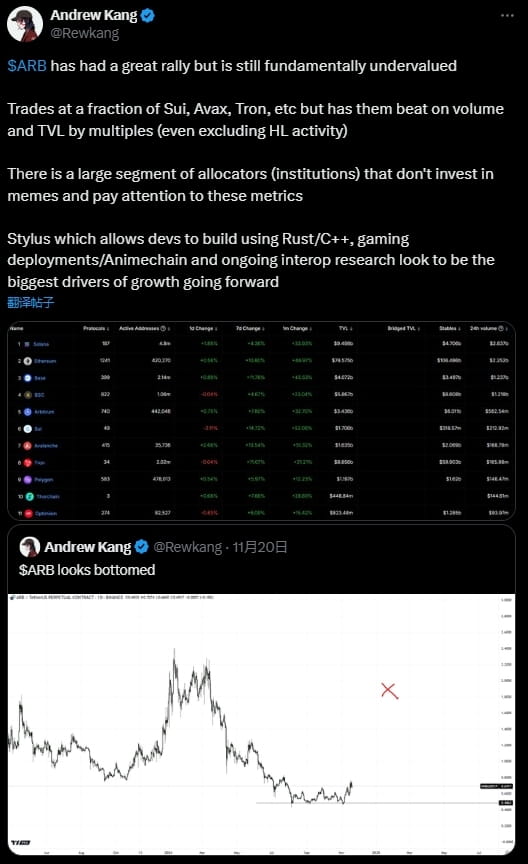 “ARB$ARB Teraz przypomina trochę niedocenianego czarnego konia.” — to bezpośredni komentarz partnera Mechanism Capital, Andrew Kanga, w jego poście na X. Zauważył, że chociaż ARB (Arbitrum) ostatnio wykazuje silny wzrost, jego cena handlowa wciąż stanowi tylko niewielką część projektów takich jak Sui, Avax i Tron, jednak jego wolumen handlowy i TVL (całkowita wartość zablokowana) są zdecydowanie na czołowej pozycji.