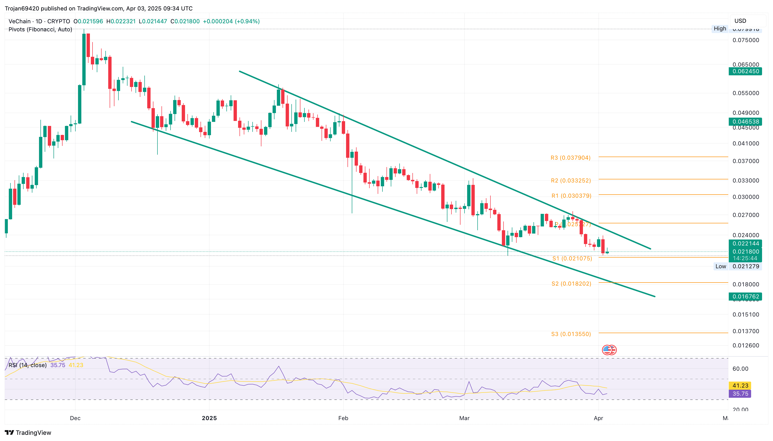 Uwięziony w opadającym klinie, VeChain (VET) sygnalizuje potencjalny punkt dotykowy na poziomie $0.018 pomimo świeżego odbicia sieci w Q1 2025.