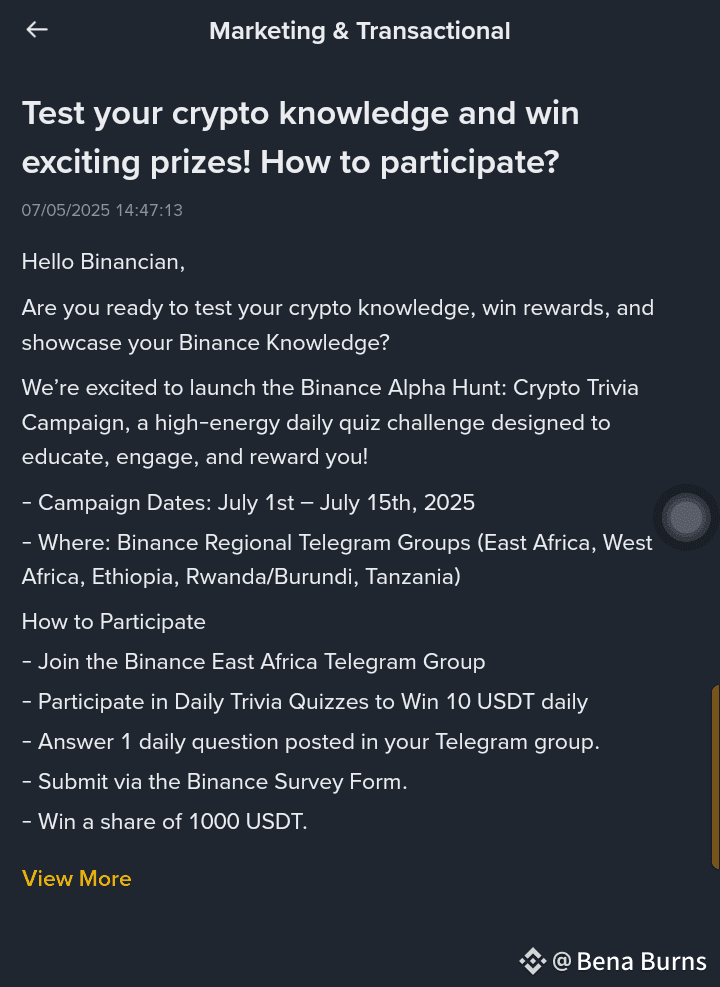 Ten Binance Alpha Hunt wygląda na zabawny i łatwy sposób na zarobienie! Wystarczy dołączyć do grupy na Telegramie, codziennie odpowiedzieć na jedno pytanie trivia, a masz szansę wygrać 10 USDT codziennie lub część z 1000 USDT. Kończy się 15 lipca, więc nie zasypiaj! 🚀💰#CryptoTrivia #EarnWithKnowledge