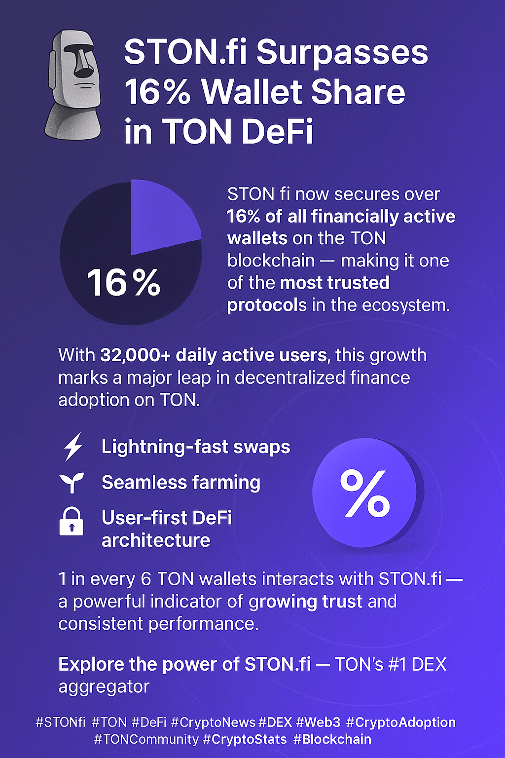 STON.fi zabezpiecza teraz ponad 16% wszystkich aktywnych finansowo portfeli na blockchainie TON, co czyni go jednym z najbardziej zaufanych protokołów w ekosystemie.