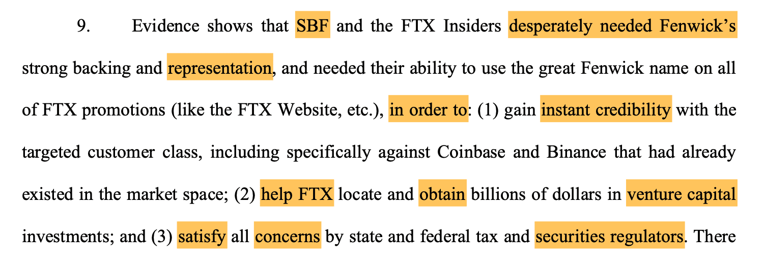 Zmieniony pozew stwierdza, że postępowania karne przeciwko byłemu dyrektorowi FTX Samowi Bankmanowi-Friedowi ujawniły nowe informacje o zaangażowaniu Fenwick. Współzałożyciel FTX Gary Wang, była dyrektor Alameda Caroline Ellison i były CTO Nishad Singh zeznali, że Fenwick został poinformowany o nadużywaniu funduszy i udzielił porad, jak ukryć takie praktyki. Singh szczególnie twierdzi, że firma pomogła zatuszować nieautoryzowane pożyczki i sfałszowane sprawozdania finansowe.