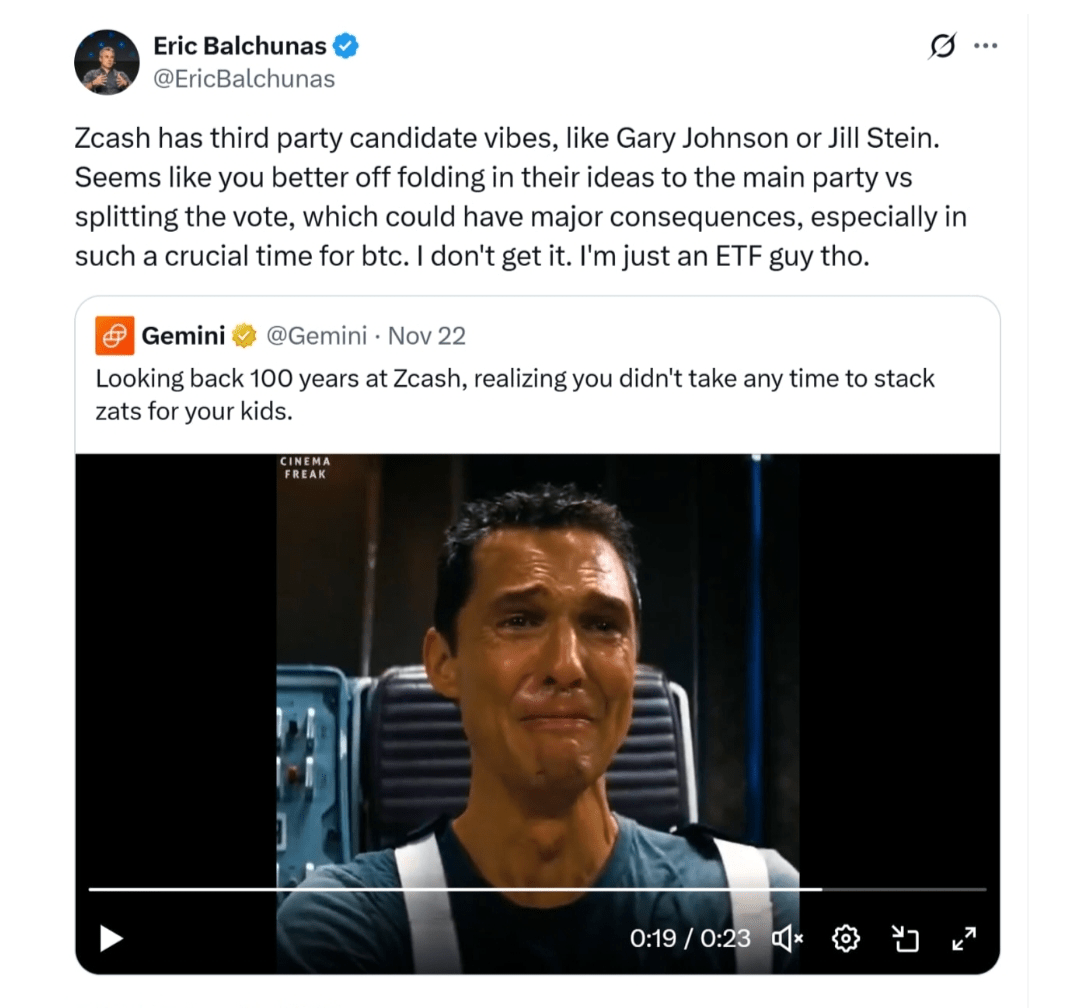 W niedawnym poście na X, Balchunas powiedział, że Zcash