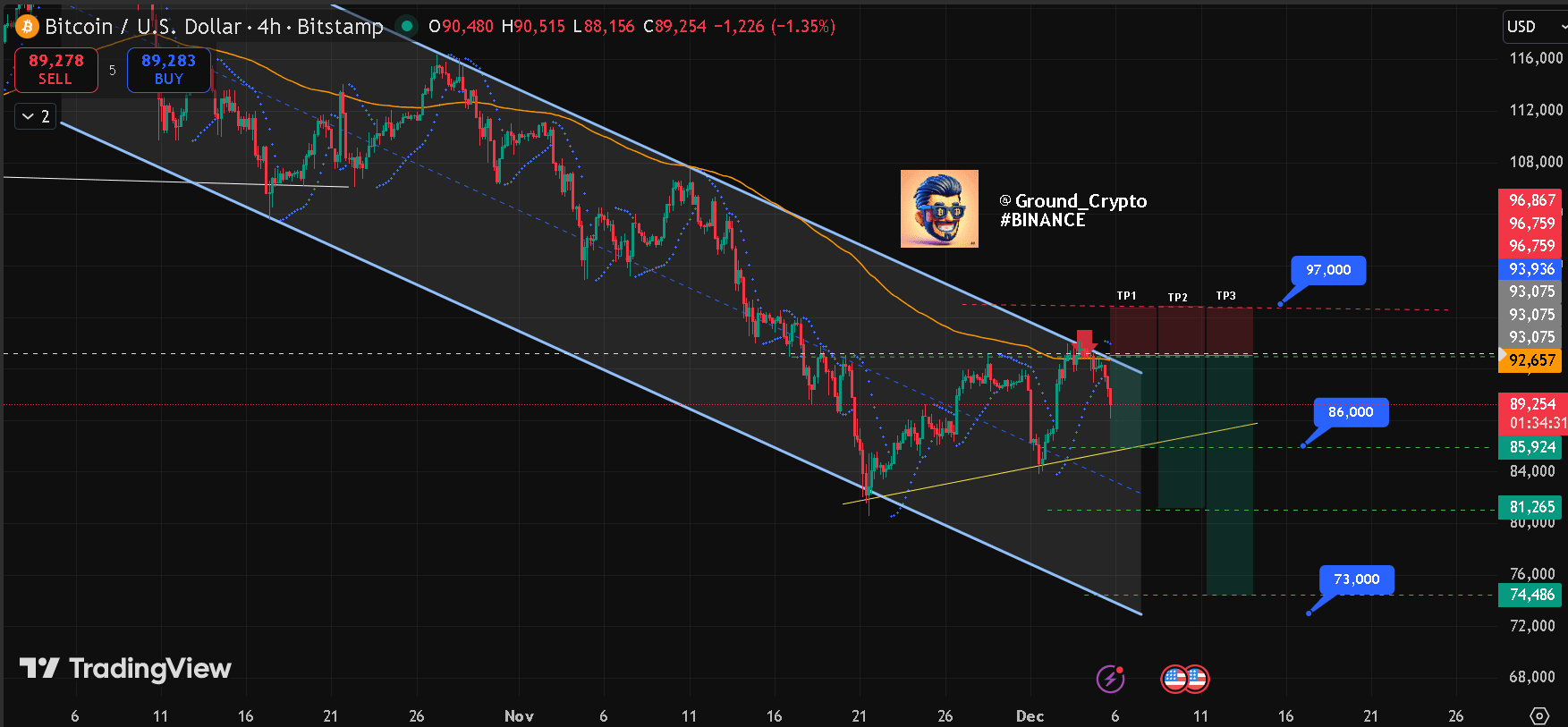 $BTC Jeśli pamiętasz mój artykuł z 3 grudnia, przewidzieliśmy #BTC napotka trudności w przekroczeniu naszego progu 94K, co dokładnie miało miejsce, a rynek obecnie zmierza w kierunku naszego obszaru TP1, który znajduje się wokół znaku 86K. Poniżej znajduje się nasze ustawienie z mojego poprzedniego artykułu.