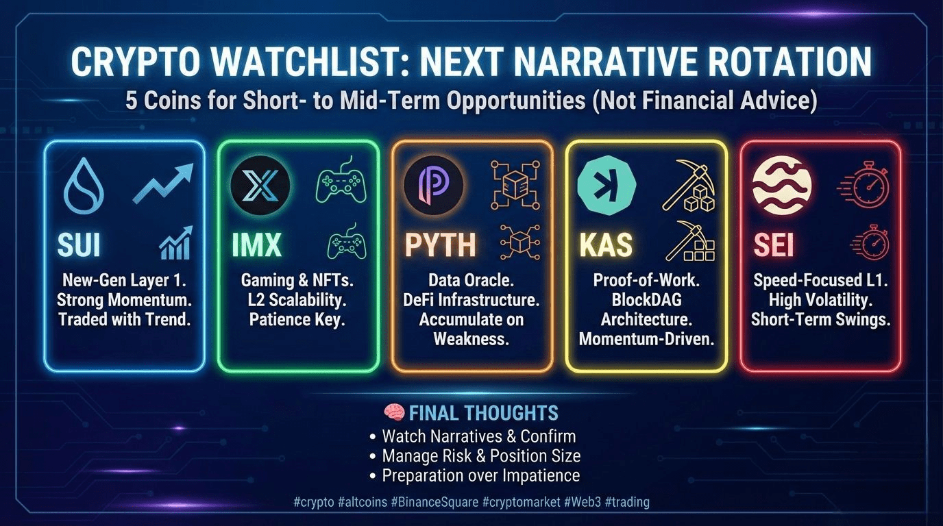 Jeśli rynek będzie nadal przemieszczał się między narracjami, oto pięć dodatkowych币, które ja osobiście śledzę uważnie pod kątem krótko- i średniookresowych możliwości. Znowu — to lista obserwacyjna, a nie zalecenie do niewyważonego zakupu.