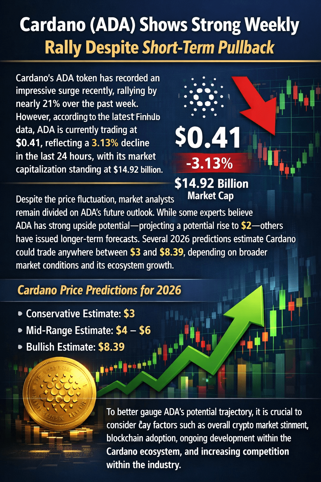 Token $ADA Cardano ostatnio zanotował imponujący wzrost, wzrastając o prawie 21% w ciągu ostatniego tygodnia. Jednak według najnowszych danych Finnhub, ADA obecnie handluje na poziomie **0,41$**, co oznacza **spadek o 3,13% w ciągu ostatnich 24 godzin**, przy kapitalizacji rynkowej wynoszącej **14,92 miliarda $**.