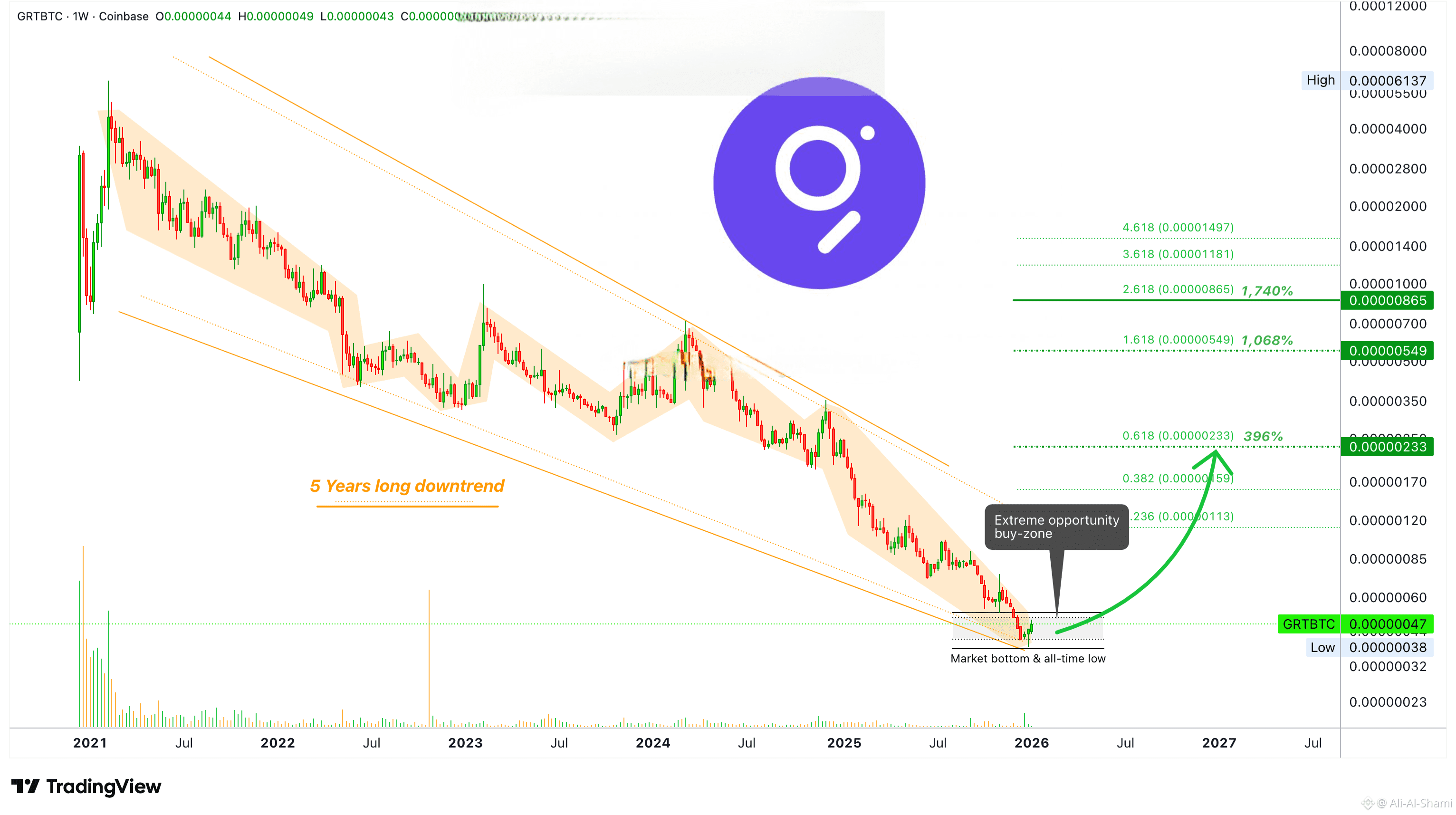 هذه سؤال جيد، وصعب الإجابة عليه. السوق دائمًا ما يسعى إلى التوازن. هنا لدينا سوق هابط طويل مدته خمس سنوات، ولا يوجد حتى أعلى مستوى أعلى واحد خلال تلك السنوات. بالعكس، يمكننا بسهولة القول إن GRTBTC مُعدٌّ لنمو مستمر لسنوات، وإنتاج أعلى مستويات وأعلى منخفضات متتالية.