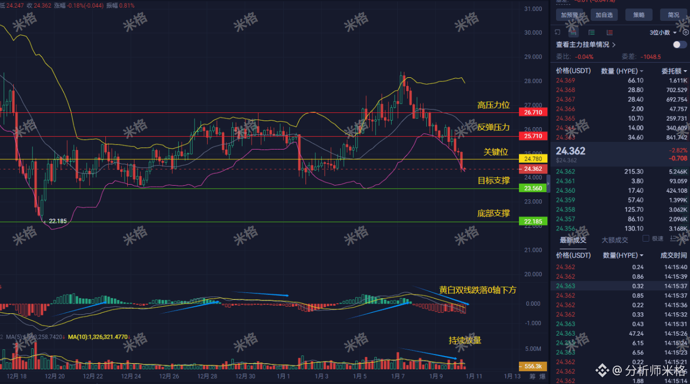 短期趋势向下未改,但下方会遇到层层抵抗,直接滑向22的可能性较小,更可能在23.5-25.7之间做一个震荡箱体。 巨鲸的动向让这个“箱体底部”变得有迹可循。今天想直接V反冲上26.7?除非有突发重大利好,否则概率微乎其微。
