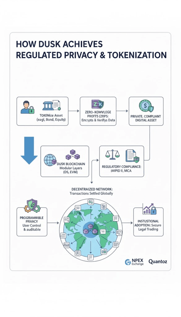 Fundacja Dusk współpracuje z regulowanymi podmiotami, takimi jak holenderska giełda NPEX, w celu wspierania tokenizacji papierów wartościowych. Ta infrastruktura umożliwia instytucjom handel papierami wartościowymi o wartości ponad 200 mln euro na rynkach wtórnych, znacznie redukując potrzebę tradycyjnych pośredników finansowych.