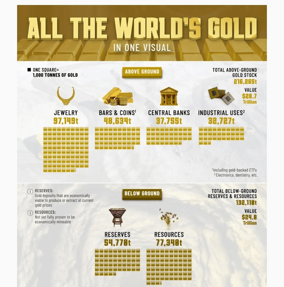 Całkowity zasób złota na powierzchni wynosi 216 265 ton, z największą częścią znajdującą się w biżuterii.