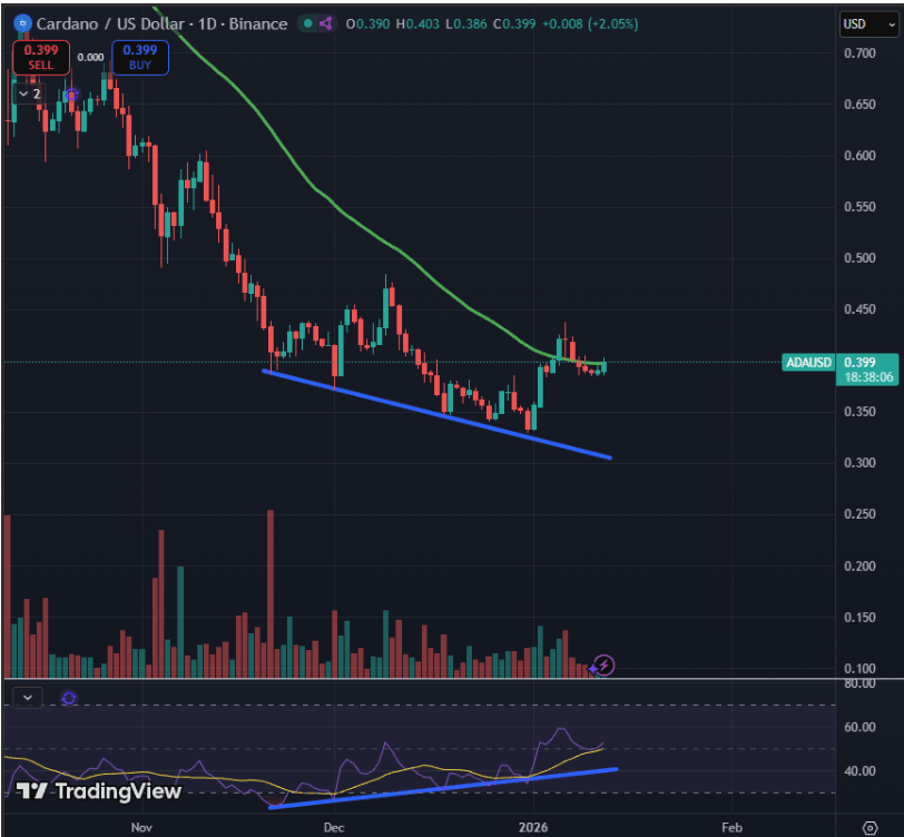 👉 Cardano w tej chwili gra podobną grę. Wykres ADA pokazuje, że cena odbija się od spadkowej linii trendu, która dotychczas ograniczała wzrosty podczas ostatniego spadku. Po tym odbiciu ADA ponownie wzrosła w kierunku zakresu 0,39–0,40 USD, śledząc stabilizację Bitcoina dość dokładnie. Oba aktywa próbują zmienić trend z tworzenia niższych minimów na budowanie czegoś bardziej konstruktywnego, choć ADA wciąż pozostaje poniżej swojej ważnej średniej ruchomej — więc ogólna perspektywa nadal pozostaje niejasna.