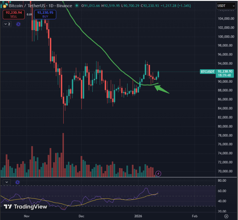 👉 Bitcoin rozpoczął tydzień na pozytywnie, czysto odbijając się od swojej 50-dniowej średniej ruchomej – poziomu, który traderzy śledzą, aby ocenić kierunek średnioterminowy. Wykres pokazuje, że BTC dobrze reaguje na to dynamiczne wsparcie, cofając się w kierunku strefy 92 000 USD po kilku sesjach konsolidacji. To typowy techniczny odbicie, które wskazuje, że presja sprzedaży może się zmniejszać.
