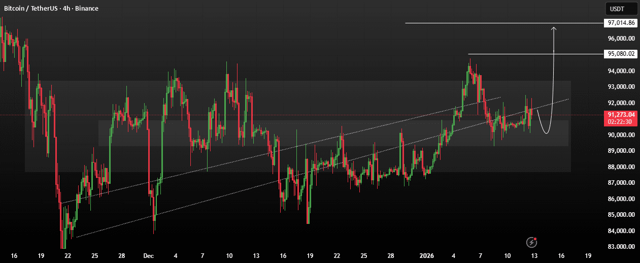 Jeśli cena utrzyma wsparcie i potwierdzi siłę, może wywołać rozszerzenie na wzrost, z przewidywanymi celami w zakresie 95 000 – 97 000. Cena BTC pozostaje na wzrost, a struktura rynku nadal sprzyja ruchom w górę, o ile wsparcie będzie utrzymywane.