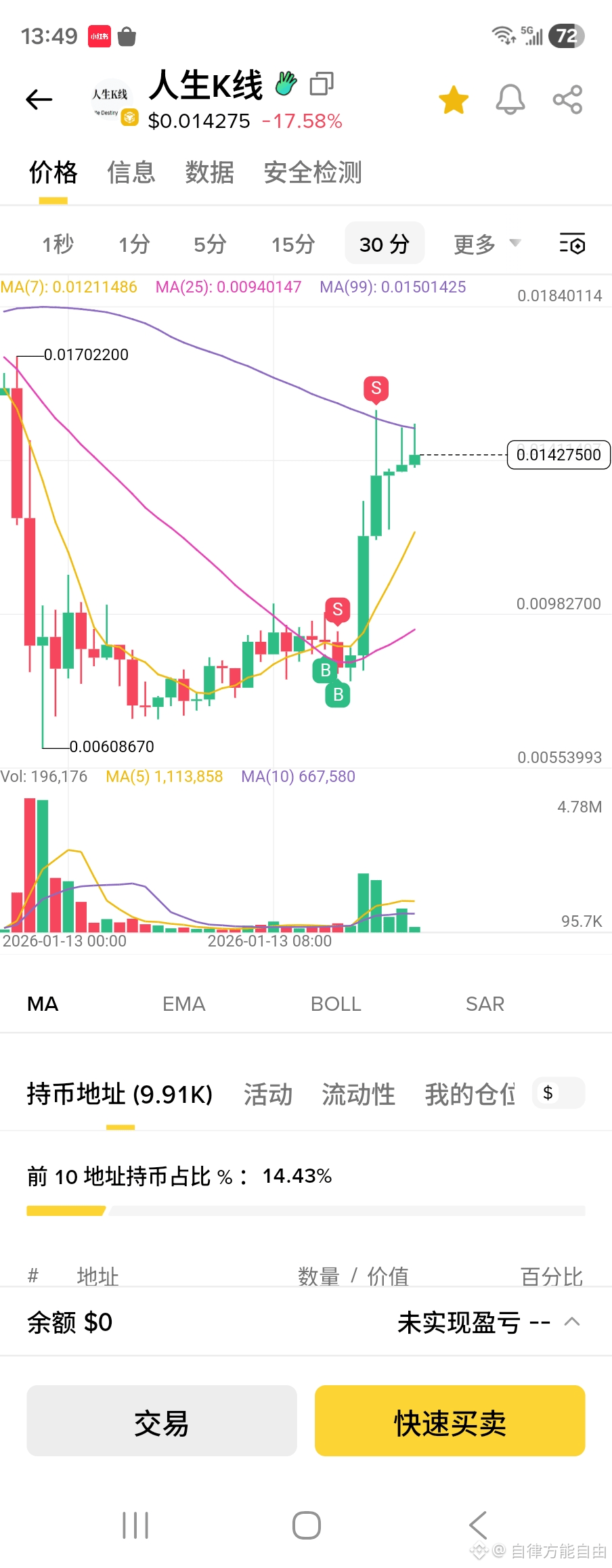 昨天打了个“小股东”,赚点就跑了。今天发现“人生K线”上了热搜前三名,且KOL和聪明钱都有一定比例持仓,便择机买卖了两笔,赚的钱正好用来定投aster。当然,烟还是继续在戒。
