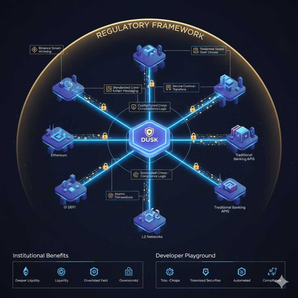Ta zdolność ma głębokie implikacje. Dla uczestników instytucjonalnych, możliwość wdrażania aktywów na wielu łańcuchach bez poruszania się po złożonych obejściach jest transformacyjna. Rozważ tokenizowane papiery wartościowe wydane na Dusk, które muszą uzyskać dostęp do protokołu pożyczkowego na innym łańcuchu. Bez interoperacyjności, aktywo jest zasadniczo uwięzione — jego płynność jest ograniczona, a potencjał niewykorzystany. Dusk zmienia tę równanie. Dzięki swojej architekturze międzyłańcuchowej token może uczestniczyć w pożyczkach, stakowaniu lub protokołach generujących zyski gdzie indziej, zachowując jednocześnie zgodność i audytowalność wymaganą przez regulatorów. Wynik to płynny ekosystem, w którym aktywa nie są statyczne, ale aktywne, nieprzerwanie znajdując najefektywniejsze ścieżki do generowania wartości.