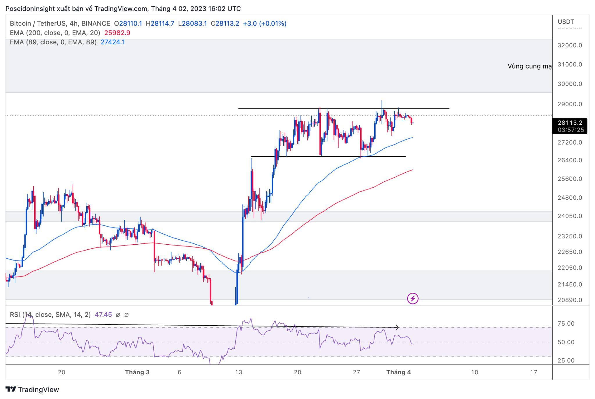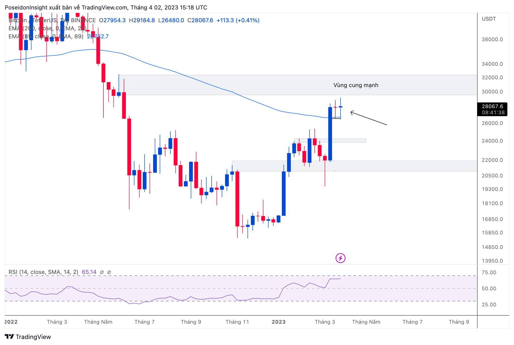 Kontynuacja to cotygodniowa świeca boczna w formie doji. Kupujący próbowali podnieść cenę, aby przetestować strefę podaży na poziomie 30 000–32 000 USD, ale nadal im się to nie udało. Sprzedający zepchnęli cenę w dół, aby ponownie przetestować EMA 89, a cena również szybko odskoczyła, więc widać, że BTC idzie w bok.
