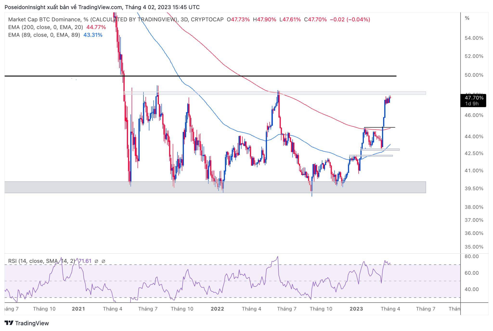 Podobnie jak BTC, BTC.D również znajduje się w trendzie bocznym, tuż poniżej silnego oporu. Oczekujemy, że BTC.D dostosuje się w najbliższej przyszłości, aby ułatwić Altcoinowi.
