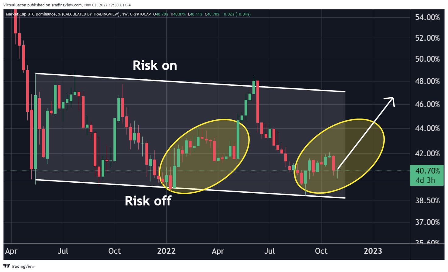 O domínio do Bitcoin teve um retrocesso esta semana, já que algumas grandes alts como ETH e DOGE tiveram grandes altas esta semana. No entanto, tome cuidado com esse movimento, pois ainda estamos em um ciclo de risco para Altcoins e o risco de manter Altcoins aqui ainda é alto.