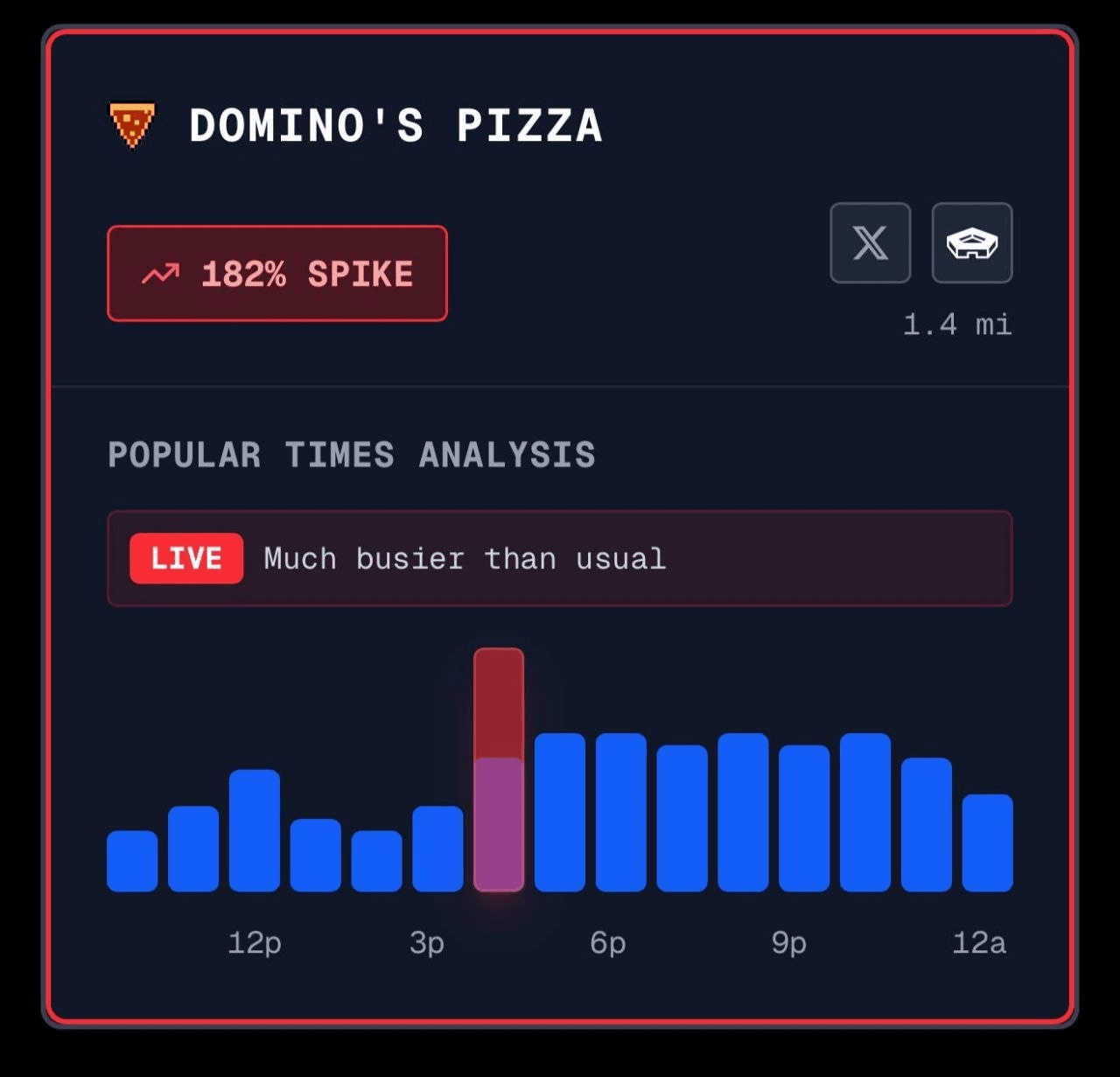 A lógica? Se os entregas de pizza aumentarem repentinamente à noite, é provável que o exército esteja ocupado — e quando o exército está ocupado, algo grande está prestes a acontecer. 📡🍕