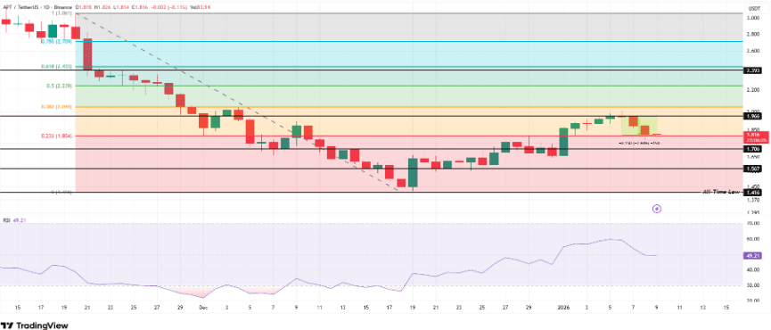 Os detentores de Aptos estão observando um período volátil de 48 horas, com um desbloqueio agendado de tokens se aproximando do mercado. Aproximadamente 11,31 milhões de tokens APT, avaliados em cerca de $20,58 milhões, estão prestes a entrar em circulação, potencialmente inundando o mercado com pressão de venda. O ativo já está mostrando fraqueza, negociando próximo ao nível de retração de Fibonacci de 23,6%, após uma queda de 7,6%. Se os compradores não absorverem a nova oferta liberada, o APT pode descer até $1,56 ou até mesmo retestar seu recorde mínimo histórico de $1,41. Por outro lado, uma forte recuperação a partir dos níveis atuais poderia levar a um novo teste de $1,96, embora esse cenário represente uma luta difícil diante do atual ambiente macroeconômico bearish.