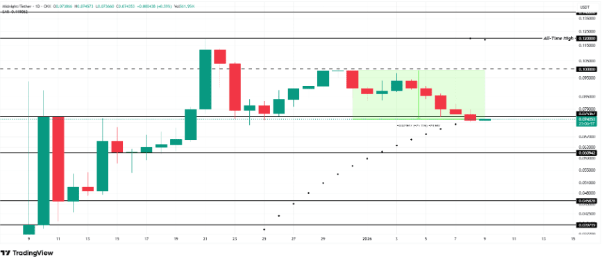 Meia-noite (NOITE) é atualmente o "desempenhador inferior" do trio, caindo 26% após falhar em superar a resistência psicológica de $0.100. Indicadores técnicos como o Parabolic SAR mudaram para uma posição bearish, reforçando a tendência descendente enquanto o ativo luta para encontrar um piso. Após perder o suporte de $0.075, o NIGHT está agora vulnerável a uma queda adicional em direção ao nível de $0.0609. Embora um influxo repentino de capital possa teoricamente desencadear um salto até sua máxima histórica de $1,20, a narrativa atual de "baixa demanda" sugere que o fim de semana pode trazer mais consolidação ou queda adicional em vez de uma reversão explosiva.