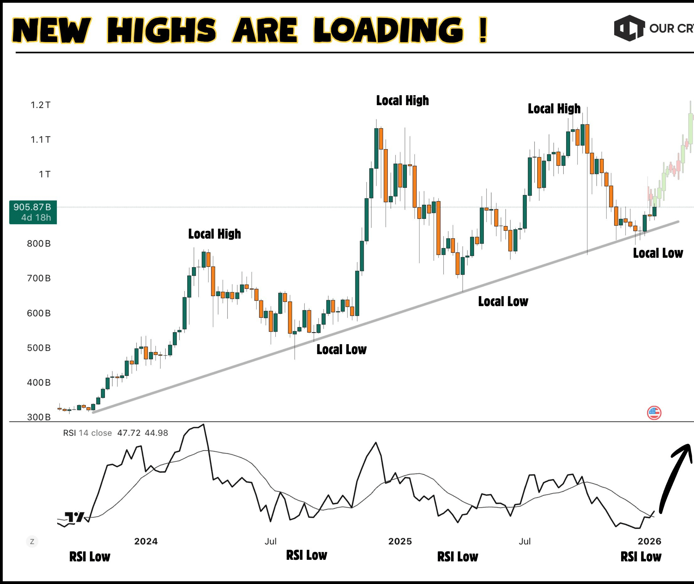 Toda vez que o RSI alcançou essas zonas baixas no passado, ele não sinalizou o fim da tendência. Sinalizou que o combustível estava sendo recarregado. Cada reinicialização do RSI foi seguida por uma fase de forte expansão no Total3.
