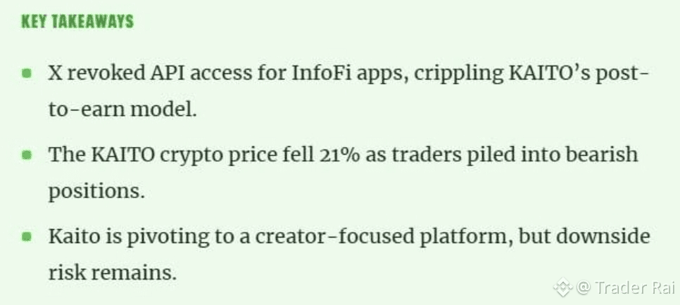 When X abruptly pulled API access for InfoFi apps, the impact was immediate. Entire “post-to-earn” models stalled overnight. $KAITO felt it first — price dropped, systems broke, and creators who relied on that pipeline were left asking a hard question: