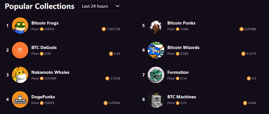 No mercado de negociação Magicden, o maior volume de transações nas últimas 24 horas é Bitcoin Frogs, com um volume total de 10k, um total de 54,7466 BTC negociados e o preço mínimo é de 0,0034btc.