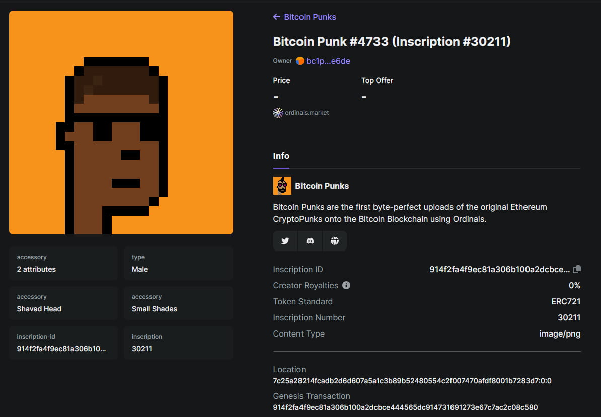 Bitcoin Punks foram os primeiros a enviar bytes originais do Ethereum CryptoPunks para o blockchain Bitcoin usando o protocolo Ordinals. O fornecimento total é de 10.000 e um total de 8.500 ETH foram negociados.