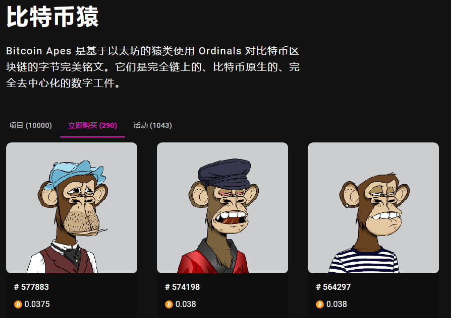 Há também Bitcoin Apes que pode ser adquirido na plataforma ordswap, e o preço mínimo atual é 0,0375 BTC.