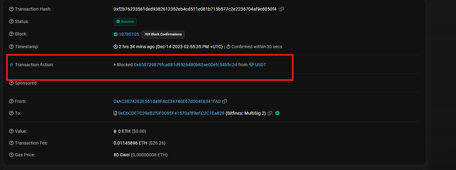 De asemenea, se știe că Tether a blocat adresa portofelului hackerului. În „Imaginea 4” putem vedea această acțiune.