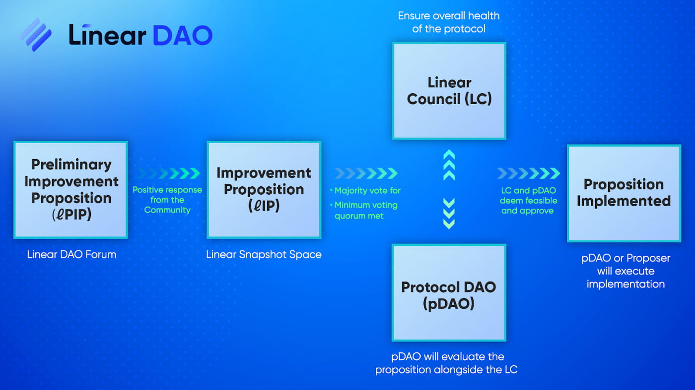 DAO liniar este format din Participanți comunitari (deținătorii $LINA), Consiliul liniar care verifică propunerile și supraveghează starea de sănătate a protocolului și Protocolul DAO care controlează fluxul de fonduri și responsabil pentru implementarea ℓIP/ℓLP.