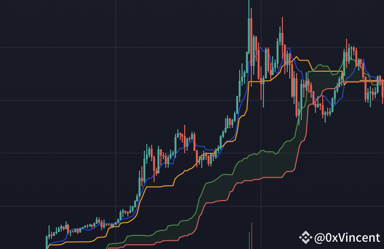 当价格位于云带上方时,云带以绿色呈现,表明多头占据优势,作为支撑带使用;