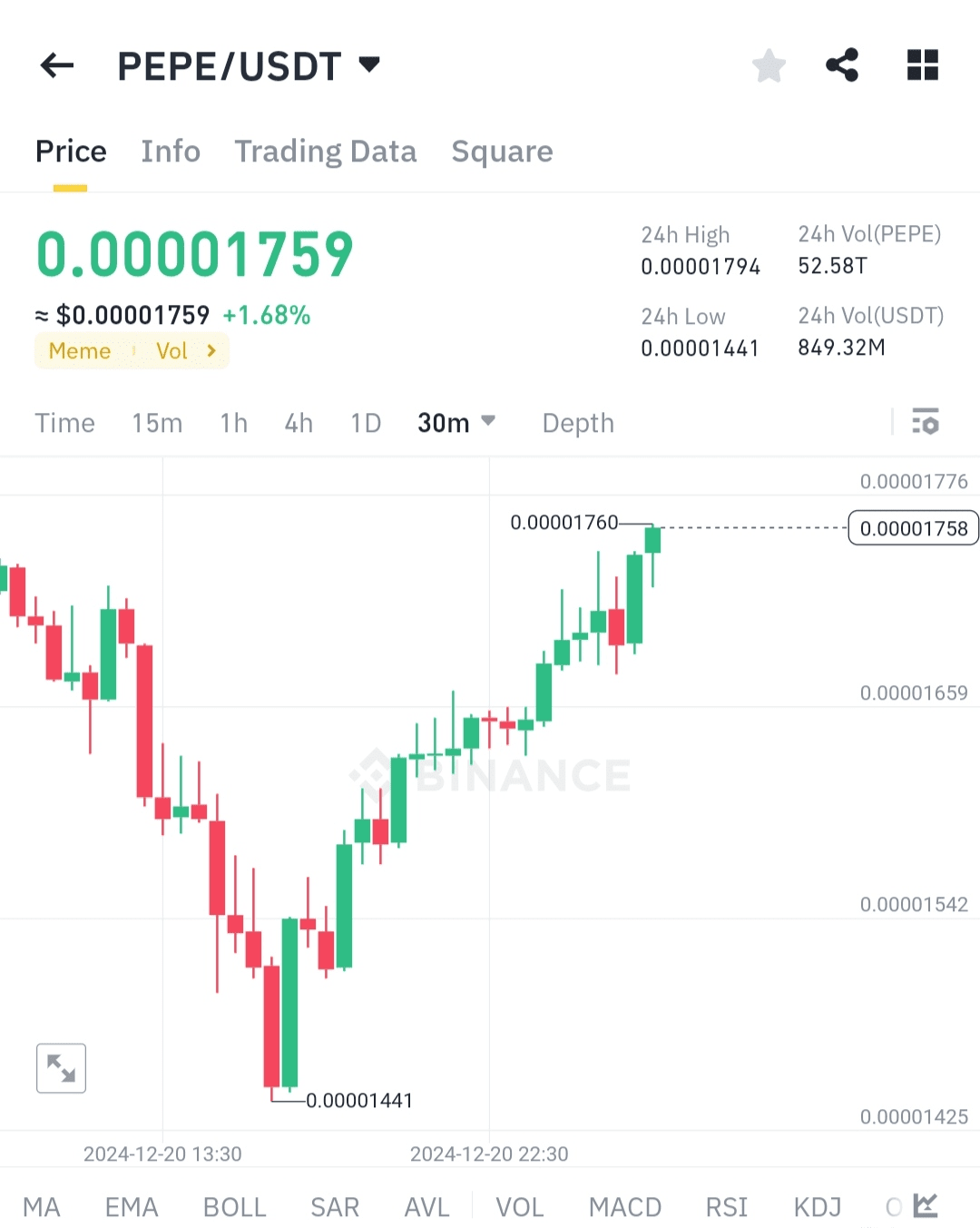 🐸$PEPE a prezentat un impuls moderat ascendent, tranzacționându-se în prezent la 0,00001746 USD, în ușoară creștere cu 0,81%. După ce a revenit la nivelul minim de 24 de ore de 0,00001441 USD, se îndreaptă către o zonă cheie de rezistență, semnalând o potențială volatilitate.