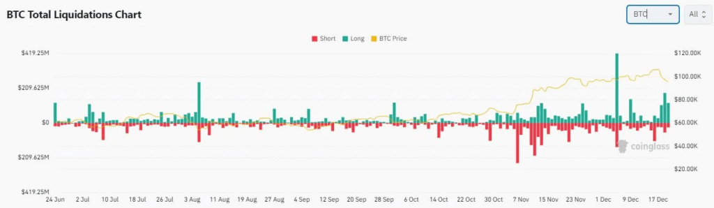 În plus, presiunea de vânzare a declanșat lichidări crescute, conducând astfel la un efect de levier redus. Aproximativ 409,42 miliarde USD în lichidări lungi au avut loc în ultimele trei zile.