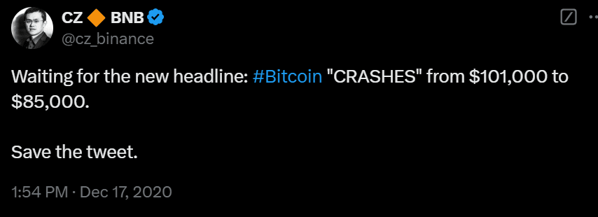 Acesta include fostul director al Binance CZ, care a dezvăluit într-un tweet recent că plănuia să scadă la 80.000 de dolari.