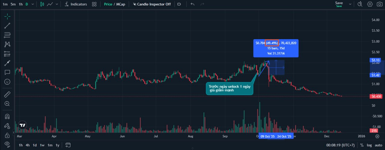 Conform teoriei deblocării token-urilor -> vânzare -> prețul scade, dar conform istoriei, prețul înainte de data de deblocare a scăzut puternic, dar după aceea a crescut invers și mai puternic în perioada de după deblocarea token-urilor pentru VC și echipa proiectului