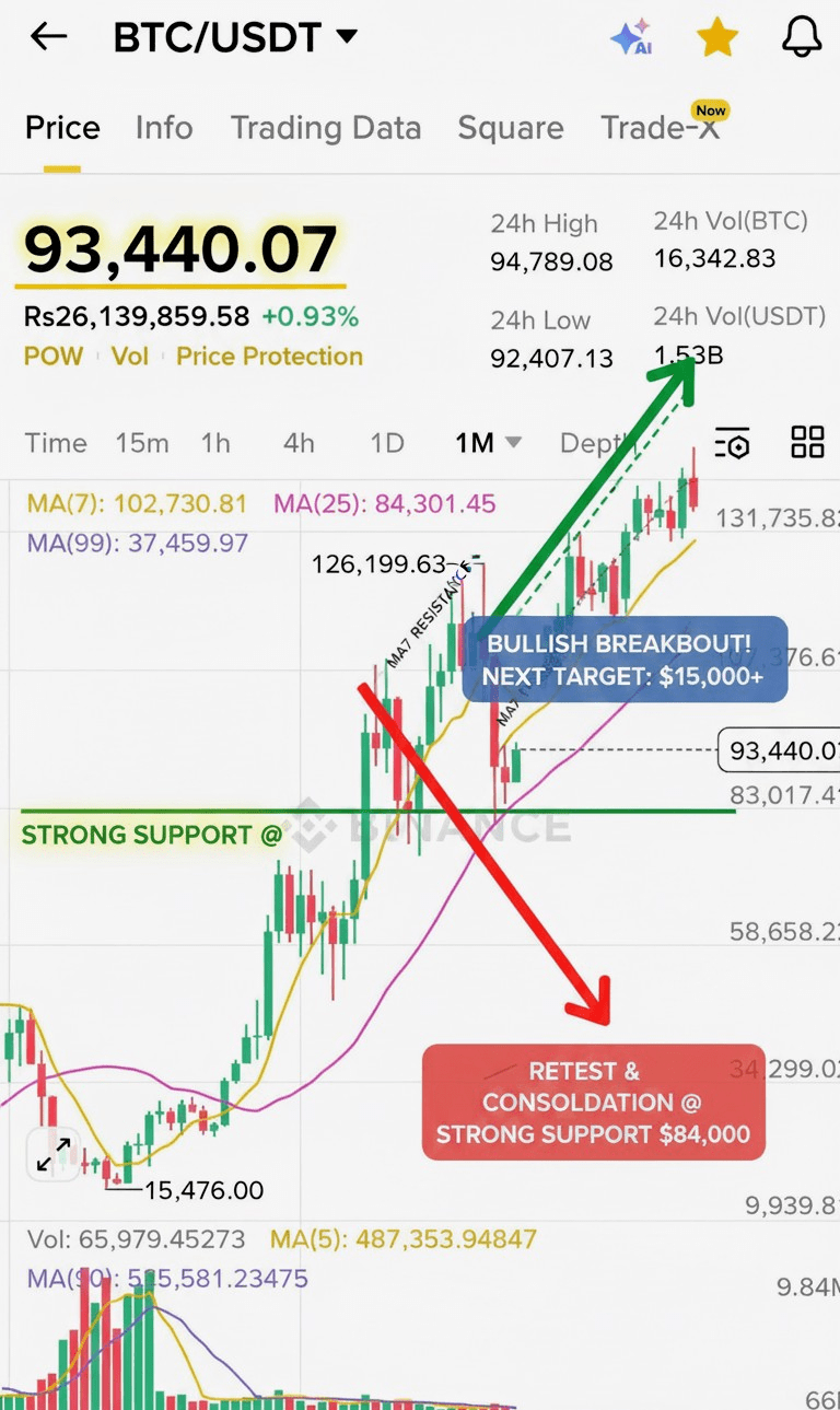 Bitcoinul ($BTC) arată o rezistență puternică pe graficul lunar! După ce a atins un vârf de 126.199 USD, am observat o corecție sănătoasă, iar acum BTC se stabilizează în jurul nivelului de 93.440 USD.