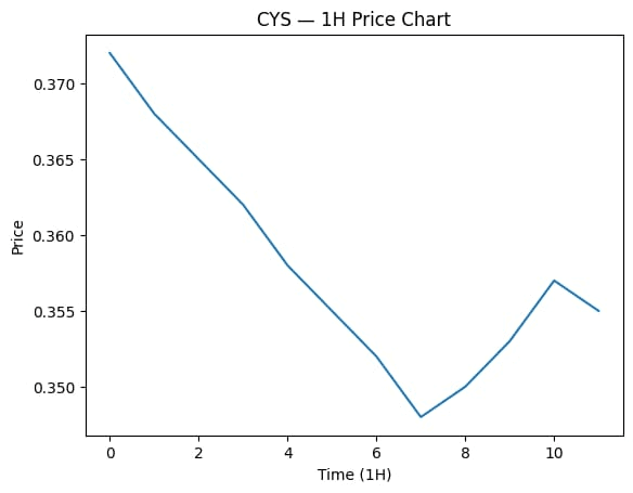 CYS se mișcă într-un interval choppy după ce nu a reușit să mențină vârful recent aproape de 0.39. Prețul s-a retractat și acum se tranzacționează în jurul nivelului 0.35, unde cumpărătorii încearcă să încetinească mișcarea.