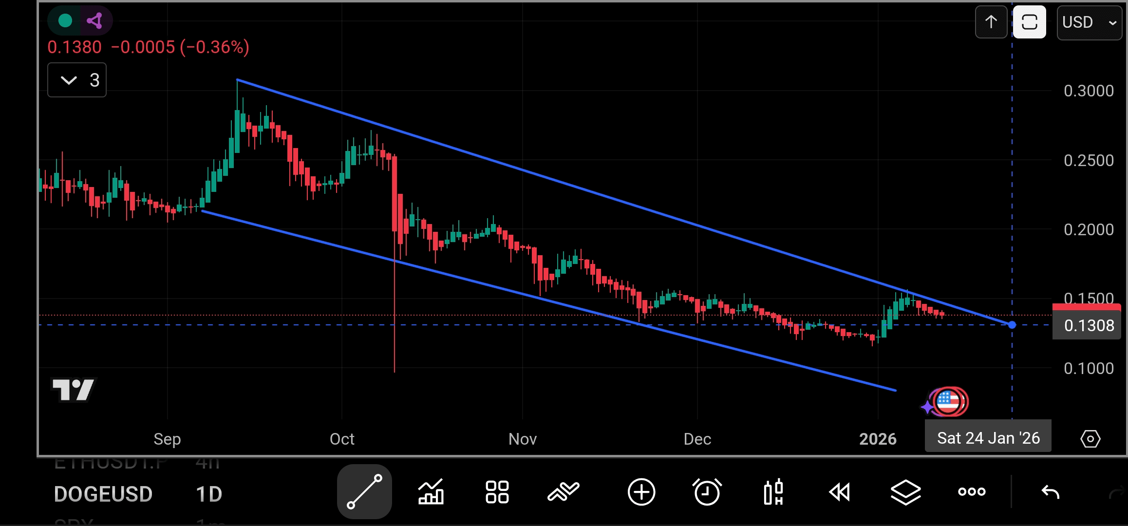 La data de 12 ianuarie 2026, Dogecoin ($DOGE) se tranzacționează în jur de 0,137 USD, reflectând o creștere modestă de 0,5% în ultimele 24 de ore, dar o scădere de 7% în ultima săptămână, în contextul unei consolidări generale a pieței. Cu o capitalizare de piață de aproximativ 20,5 miliarde USD, DOGE se află în top 10 criptomonede, susținut de comunitatea sa loială și de unele recomandări din partea unor personalități precum Elon Musk. Volumul zilnic de tranzacționare se situează la aproximativ 1,2 miliarde USD, indicând o interes constant, deși există volatilitate.