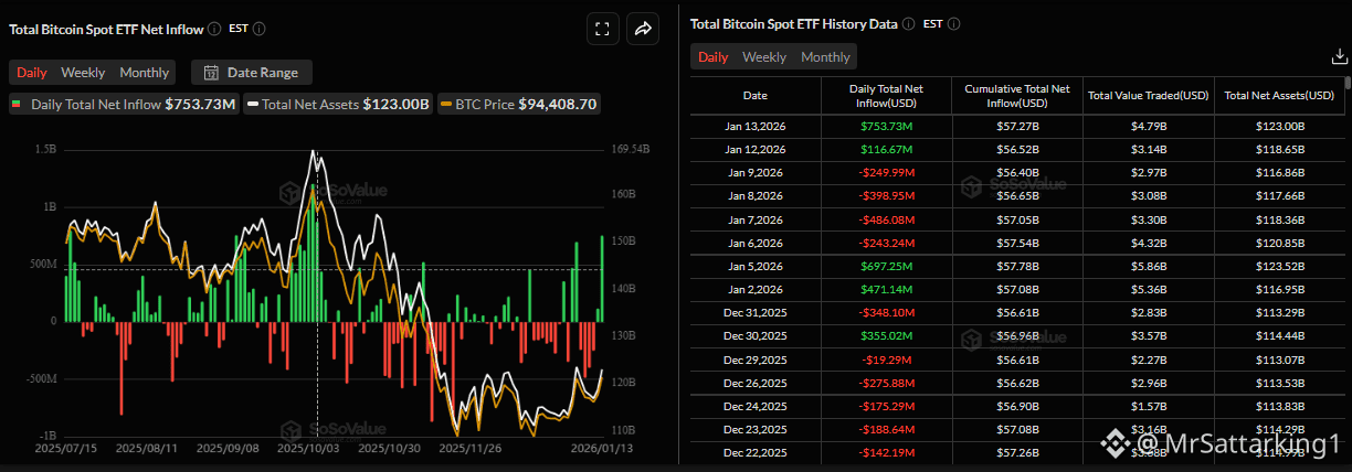 Institutional demand has continued to strengthen this week. SoSoValue data show that Bitcoin spot ETFs recorded inflows of $753.73 million on Tuesday, the highest single-day inflow since October 6. If this inflow continues, BTC could extend its ongoing rally.