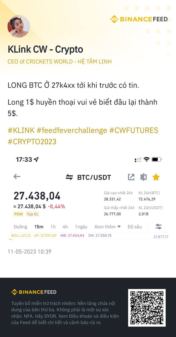 De exemplu, ieri Linh a postat că Long Btc era la 27k4xx înainte de știri. Era înainte de 19:30 GMT +7 Vietnam.