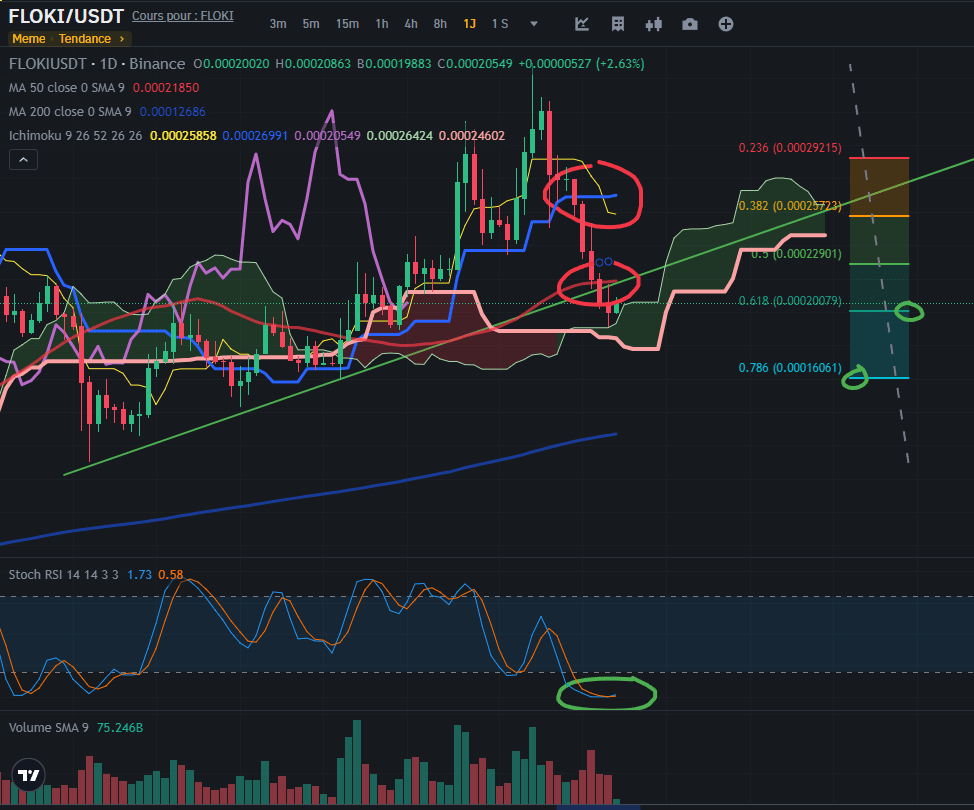 În prezent, piața criptomonedelor se confruntă cu o oarecare instabilitate, cu o slăbiciune marcată în general. Pentru Floki (FLOKI), putem observa că între ieri și astăzi și-a spart linia de tendință ascendentă și, simultan, a trecut sub media sa mobilă pe 50 de zile (MA50). Acestea sunt semnale puternice de urs.