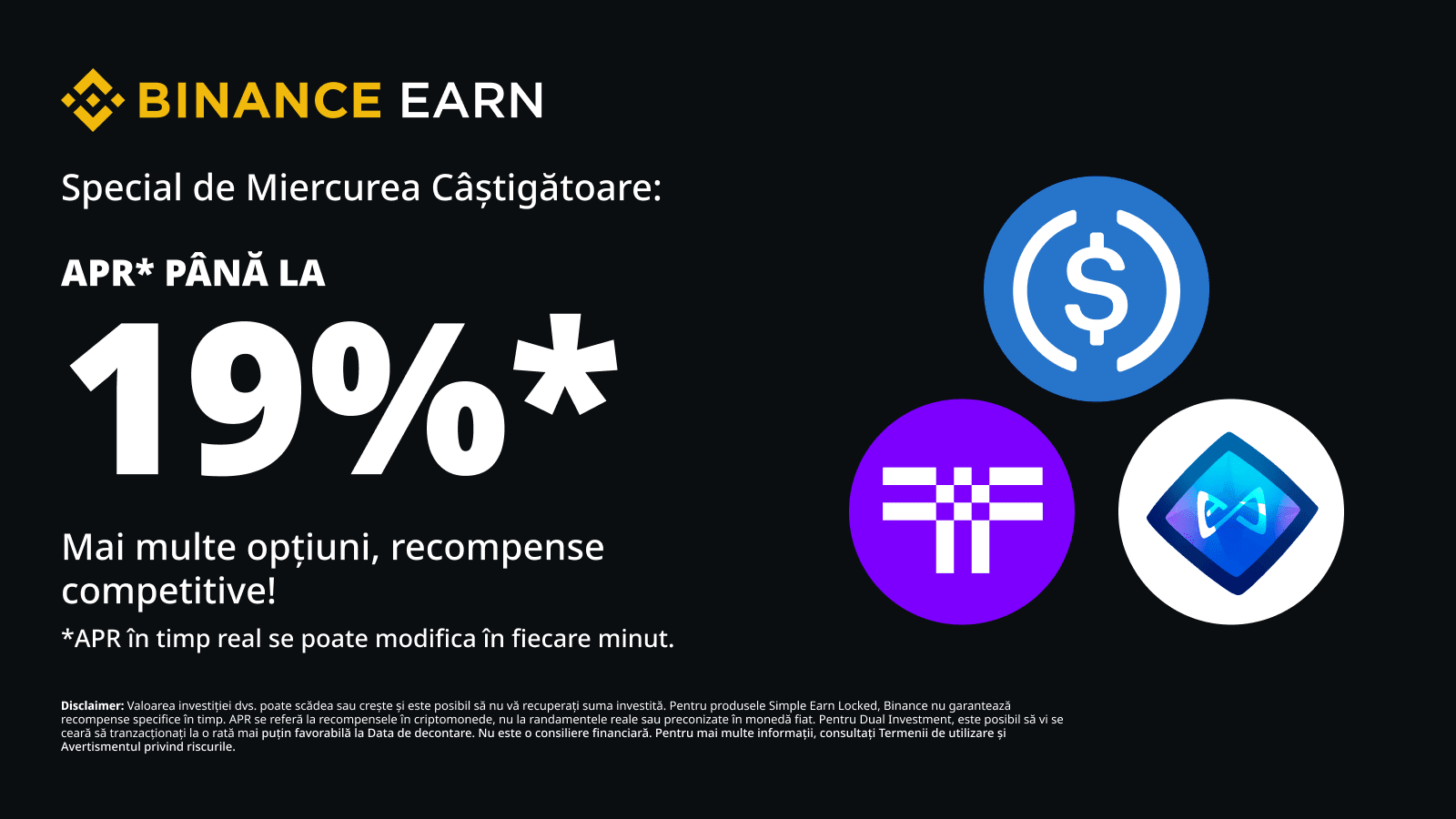 Binance Earn vă prezintă oferte noi care vor fi lansate în fiecare miercuri. Urmăriți Miercurea câștigătoare pentru a obține recompense din Simple Earn, ETH Staking, SOL Staking, Investiție duală și multe altele.