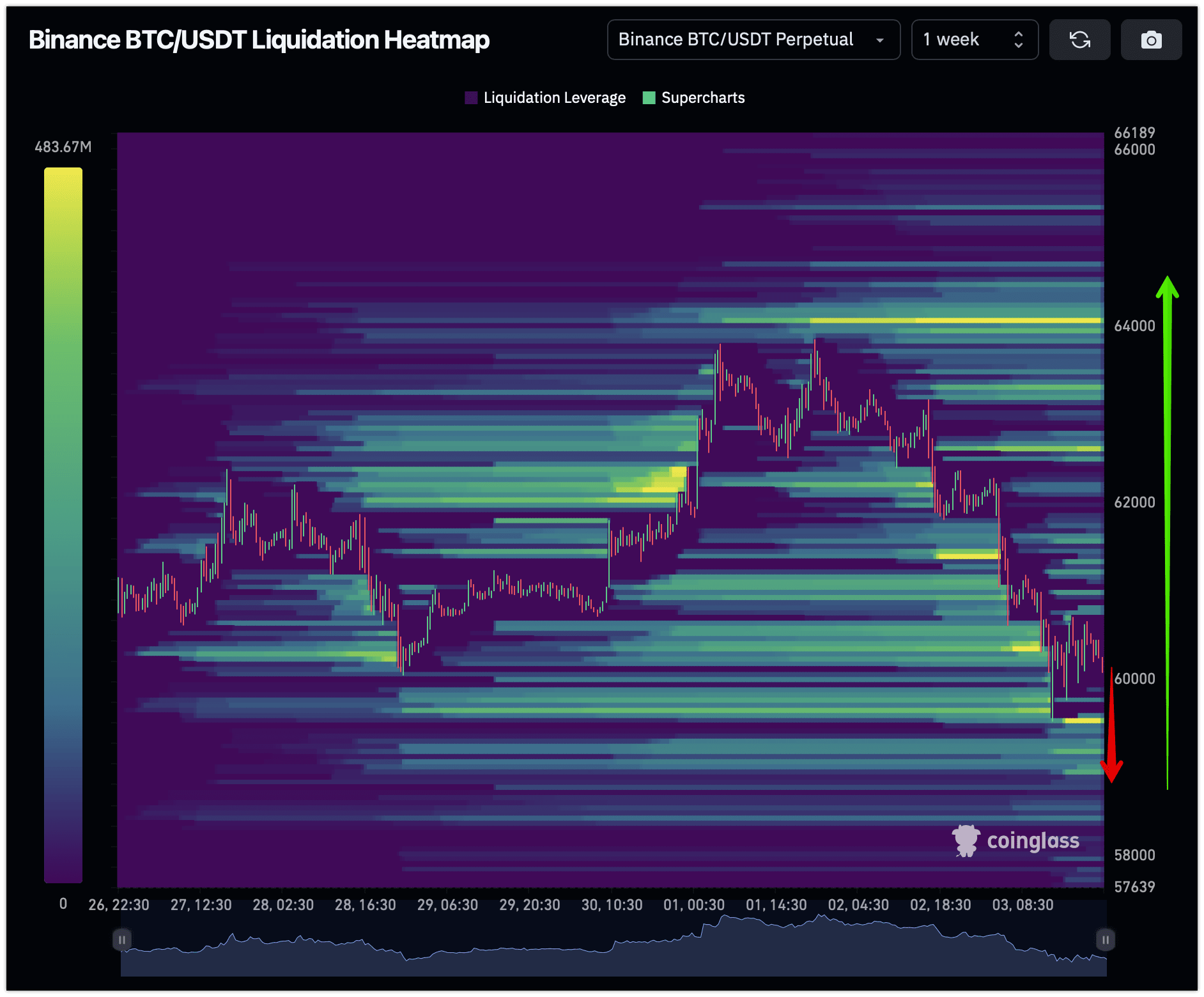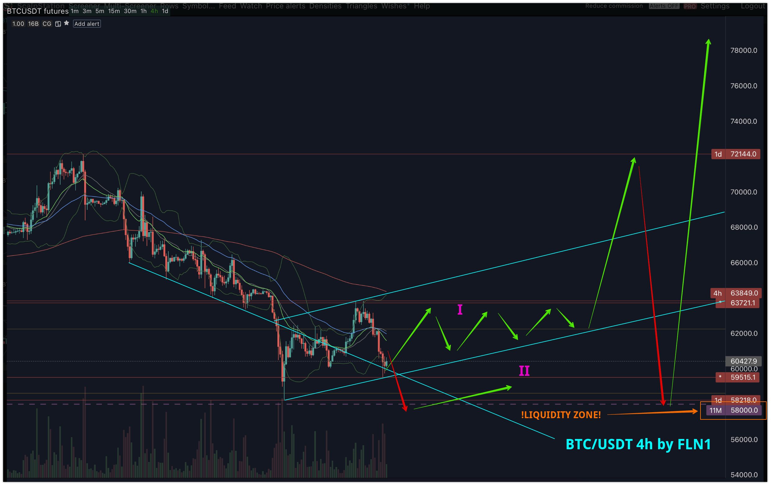 • Зони ліквідності: Область між $58,000 та $60,000 є зоною високої ліквідності, де ймовірно відбудуться суттєві цінові рухи.