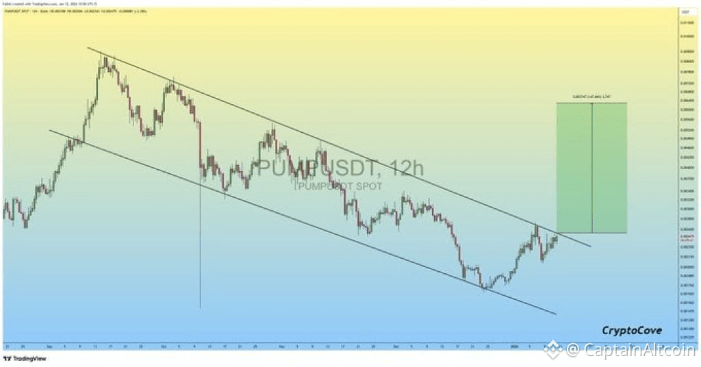 On the 12-hour chart, the Pump.Fun price has been trading inside a clear descending channel for an extended period. Each rally attempt has been capped by the upper trendline, while lower lows continued to form along the bottom of the channel. This structure usually reflects controlled selling rather than panic.